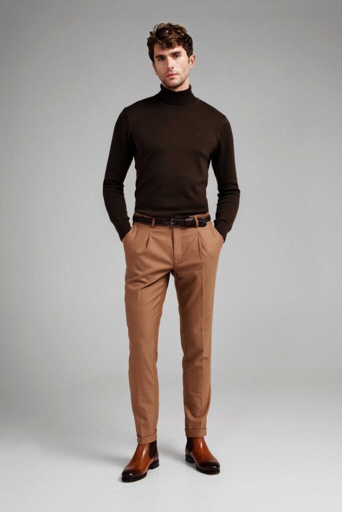 La elección del calzado es fundamental para completar el look de un traje slim fit en tonos tierra. Una excelente opción son los zapatos de cuero en tonos marrón, que armonizan perfectamente con el traje y aportan un aire de sofisticación. Los zapatos oxford o derby en un tono marrón oscuro son ideales para ocasiones formales, como bodas o eventos corporativos. Además, para un enfoque más contemporáneo, los zapatos de gamuza en un tono más claro, como el beige o el camel, pueden ser una excelente elección para eventos semi-formales o cenas, añadiendo un toque de frescura al atuendo.